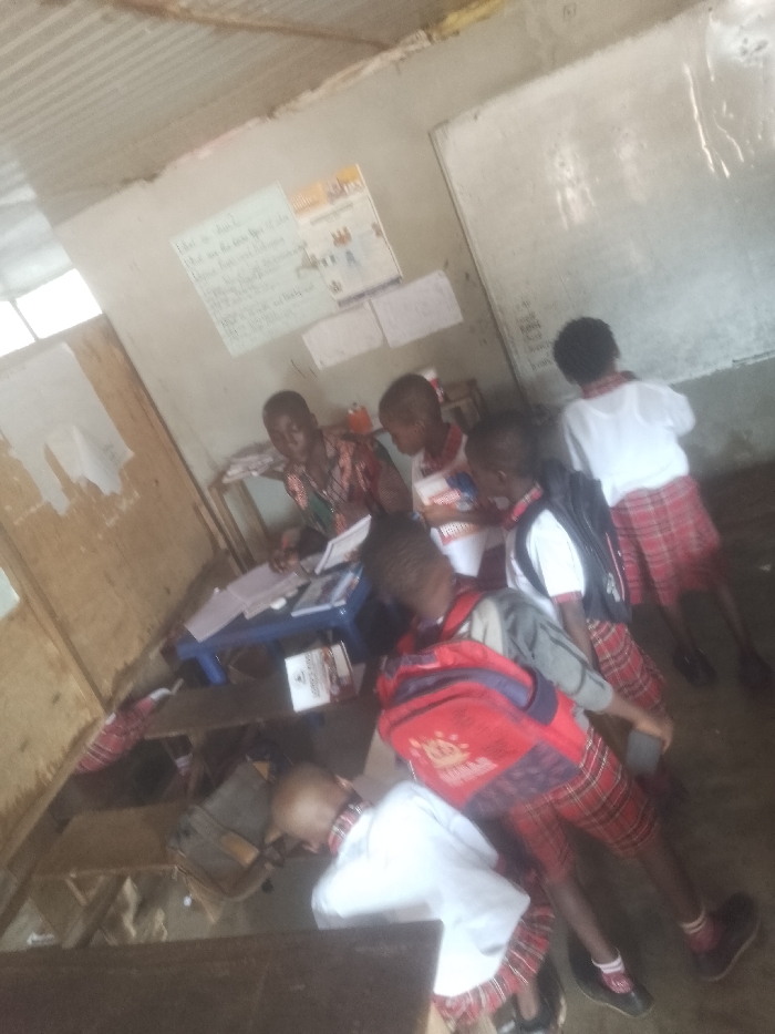 The image depicts an interior scene, identified as a classroom in Ukwu-Abwa, Nigeria