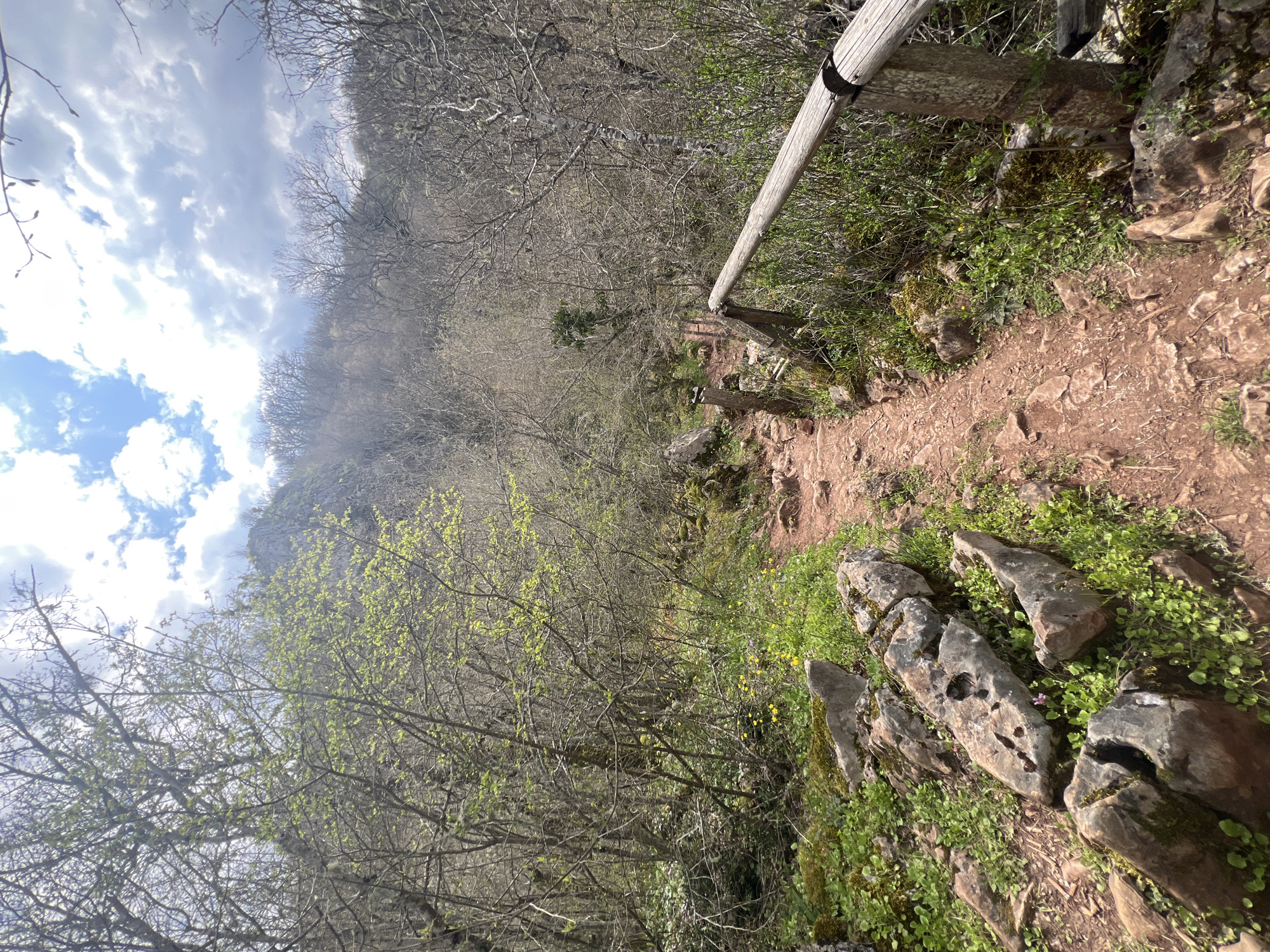The image captures a section of a hiking trail in Mladezhko, Bulgaria. The trail, composed of red-brown earth and stones, descends alongside a rustic wooden handrail. To the left, trees with new spring foliage mix with bare branches against a backdrop of a cloudy sky and a hillside. Rocks and green vegetation line the edge of the trail on the right.
