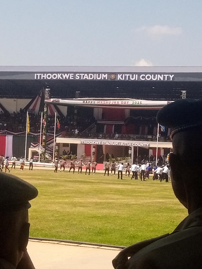 The image displays an outdoor scene at Ithookwe Stadium in Kitui County, Kenya, observed during daylight. In the foreground, the backs of two individuals are partially visible, one wearing a dark beret-like cap on the left. The midground features a large, well-maintained green grass field. Approximately 20-30 individuals are scattered across this field; a group of 10-15 individuals on the left appear to be performers in patterned or traditional attire, while other individuals are present further right. The background consists of the multi-tiered stadium stands, densely populated with spectators. Prominently displayed in large white capital letters across the upper stadium structure is "ITHOOKWE STADIUM KITUI COUNTY." Below this, a white banner with red text reads "HAPPY MASHUJAA DAY 2025." A stage area beneath the banner is decorated with vertical red, white, and black panels, and several flags are visible on poles. The sky above is light blue with scattered white clouds.