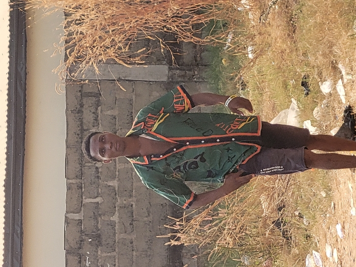 A young man stands outdoors with a building on the left and dry grass on the right. He is wearing a green, patterned shirt with orange trim and dark shorts. A white wristband is visible on his right wrist. The ground is covered in dry grass and some trash. The building appears to be made of brick with a corrugated roof. The overall scene is sunny and casual.