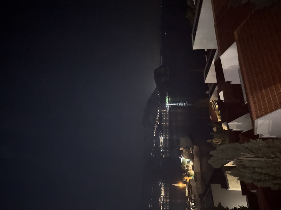 Night view of a coastline. The sky is dark, and the buildings along the coast are illuminated with yellow lights. Water reflects some of these lights. On the right side of the image, a hotel or apartment building with multiple balconies is visible. The building has red tiled roofs and white balconies. A large tree or bush is in front of the building.