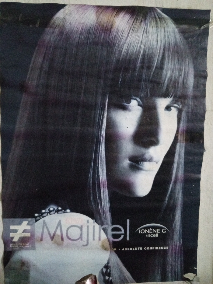 This image depicts a weathered advertisement poster affixed to a light-colored wall in the city of Keo Kouang, Laos. The poster features a female model, presented from the chest up, with her head turned slightly right and eyes directed forward. She has long, straight, dark hair with full bangs, showing subtle purple or reddish streaks. Her facial features include high cheekbones, a defined nose, and full lips, with a faint pink tone on her cheeks. A string of dark, spherical beads is visible around her neck/chest area. The poster prominently displays "Majirel" in white text, partially overlaying a soft, indistinct white circular object. Below this, smaller text reads "IONÈNE G incell" and "ABSOLUTE CONFIDENCE." To the lower left, a stylized symbol resembling a crossed-out hashtag is present with the text "ALL DIFFERENT EACH UNIQUE." The poster exhibits signs of age and wear, including creases, minor tears along its edges, and general discoloration or dirt accumulation. It is adhered to a plain, vertical surface, portions of which are visible surrounding the poster.