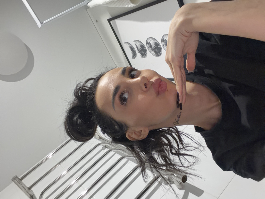 A woman with her dark hair in a bun is posing in a brightly lit bathroom. Her expression is a pout, and her hand is partially covering her face. She has a tattoo on her neck. Behind her are a white wall, a towel rack, and a framed picture of moon phases. The overall impression is casual.