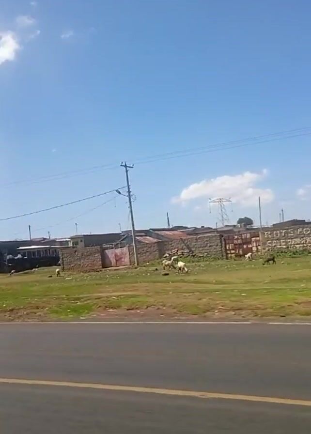 The video, shot from inside a moving vehicle, captures a view of a roadside scene. The day is sunny with a blue sky and scattered clouds. The road in the foreground has yellow lane markings. On the left side of the road, there's a grassy area where some animals, possibly goats or sheep, are grazing. Behind them is a weathered, possibly concrete, wall with what appears to be graffiti or faded signage. A large metal structure stands near the road. It appears to be a signpost structure without the actual sign. As the video progresses, a white truck moves rapidly past the camera, followed by a blurred silver vehicle. The view shifts to reveal more of the surrounding area. There are small buildings or structures visible in the background, and a sign with a phone number is seen on one of the buildings. Overhead power lines and utility poles dot the landscape. Some people can be seen on the side of the road. The environment appears somewhat rural or peri-urban.