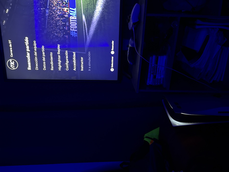 The scene depicts an indoor environment, specifically a room located in Chiapa de Corzo, Mexico, characterized by low ambient light and a predominant blue illumination. No individuals are present within the frame. A large television screen, positioned in the upper right quadrant, displays a video game interface in Spanish. The screen shows a menu from "MC Carrera de DT" (Manager Career), with options including "Reanudar partido" (Resume match), "Dirección del equipo" (Team management), and "Configuración" (Settings). The background imagery on the screen depicts a football stadium with a crowd and a segment of a green pitch, marked with a "#FOOTBALL" hashtag. Below the television, a dark-colored, two-tiered shelf unit is visible. The top shelf holds two white video game controllers, one of which is connected by a white cable. The bottom shelf contains a stack of horizontally arranged video game cases and a loose pile of white papers or documents. To the immediate left of the shelf unit, a white PlayStation 5 console stands vertically. Its internal lighting emits a distinct white glow from its central vents, contrasting with the room's overall blue hue. Further to the left, partially obscured, is an object displaying a neon green surface. The room's walls are dark and uniform, reflecting the blue light from the television.