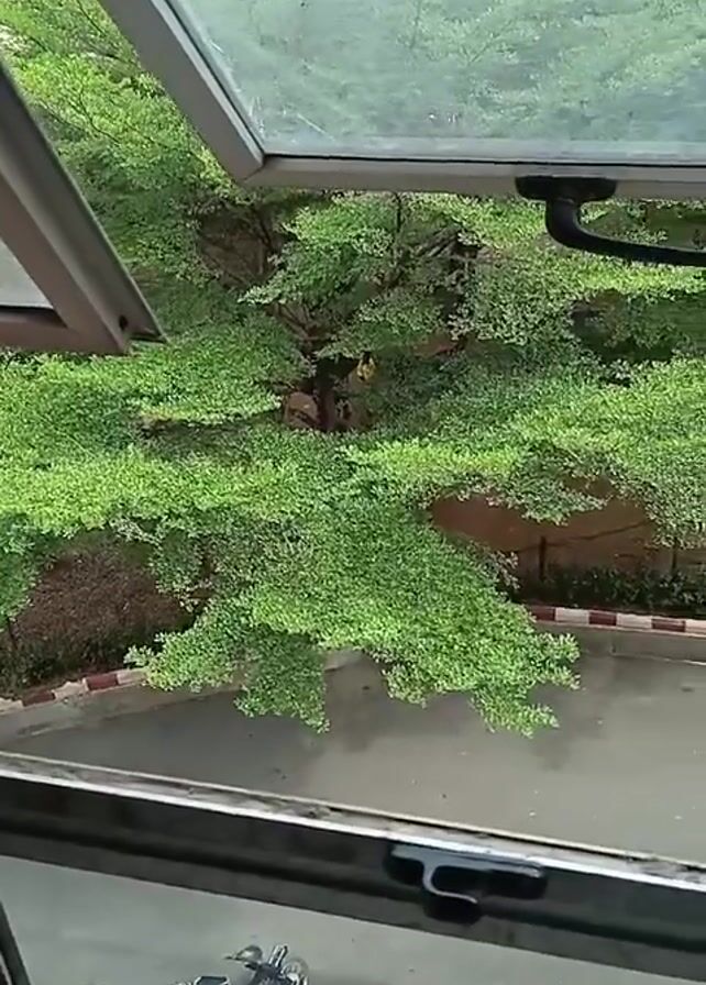 From the vantage point of an opened window, the video shows a scene of greenery dominated by a large tree