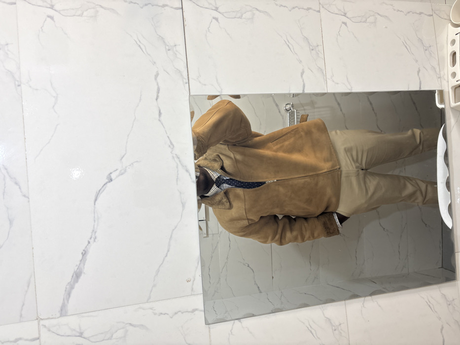 A mirror selfie taken indoors depicts an individual, presumably an adult male, from the chest down, reflecting in a rectangular mirror. The person is dressed in a tan/camel-colored suede-like bomber jacket with a fur-lined collar and cuffs, worn over a light-colored checkered dress shirt and a dark blue tie with white polka dots. Light brown/khaki trousers complete the attire, with one hand resting in a pocket. The background, both above and reflected in the mirror, consists of glossy white ceramic tiles with grey marble-like veining. Visible in the reflection behind the individual is a chrome wall-mounted rack or shelf, suggesting an interior space like a bathroom or dressing area within a residence or establishment. The lighting appears artificial, with a bright reflection spot on the upper wall tile. While no specific identifiers tie the image directly to Jos, Nigeria, the environment is consistent with a modern urban interior found in cities like Jos.