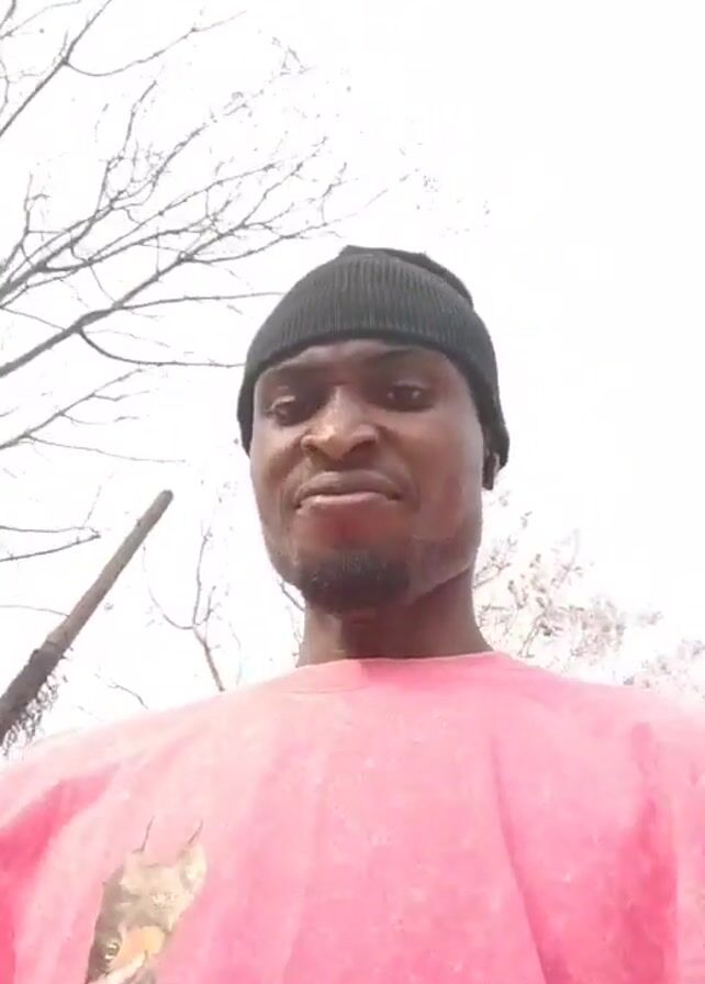A man with dark skin and a goatee stands outside, looking at the camera. He is wearing a pink shirt with a dog graphic and a black beanie. He takes off a pair of black sunglasses. The background is bright with trees. There is a stick leaning into the frame on the left.