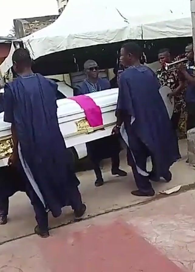 funeral procession. Six men in dark blue robes are carrying a white and gold coffin. A pink cloth is draped over the top of the coffin. They are emerging from a driveway near a white minivan, labeled with black lettering. A tent is set up in the background. Several other men are present, some playing brass instruments. The scene appears to be taking place outdoors on a paved surface. A brick wall and gate are visible in the background.