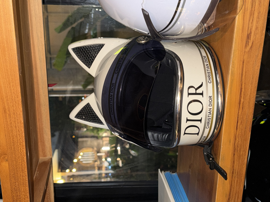 The scene depicts an interior setting, likely a commercial establishment, in Tibubeneng, Indonesia, viewed at night. Two motorcycle helmets are displayed on a light brown wooden shelf. The prominent helmet on the left is white, featuring two white cat-ear attachments on the top and a dark, tinted visor partially raised. The helmet is branded with "DIOR" in black uppercase letters on its front, with "CHRISTIAN DIOR" repeated along a lower, metallic-colored band. A black chin strap is unfastened on its left side. To its immediate right, a second white helmet with horizontal metallic stripes and a clear visor is partially visible. A stack of items with light blue edges rests on the wooden shelf to the far left. In the background, through a large glass window, a blurred outdoor environment is visible, illuminated by numerous warm-toned artificial lights, including string lights, and features distant green foliage. No individuals are present.