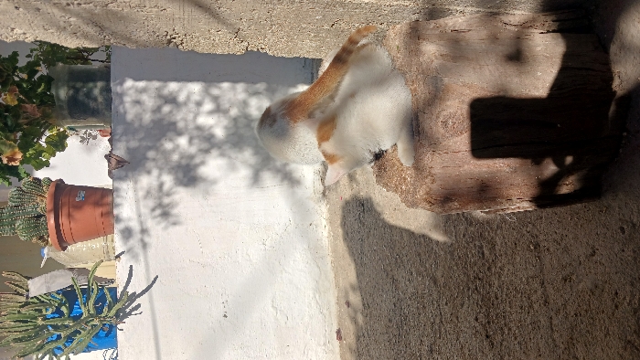 - "An outdoor scene in Menderes, Turkey, features a white and light brown/orange cat sitting on a large, rough-hewn wooden tree stump" by FM-KlF1C3, licensed under CC BY 4.0