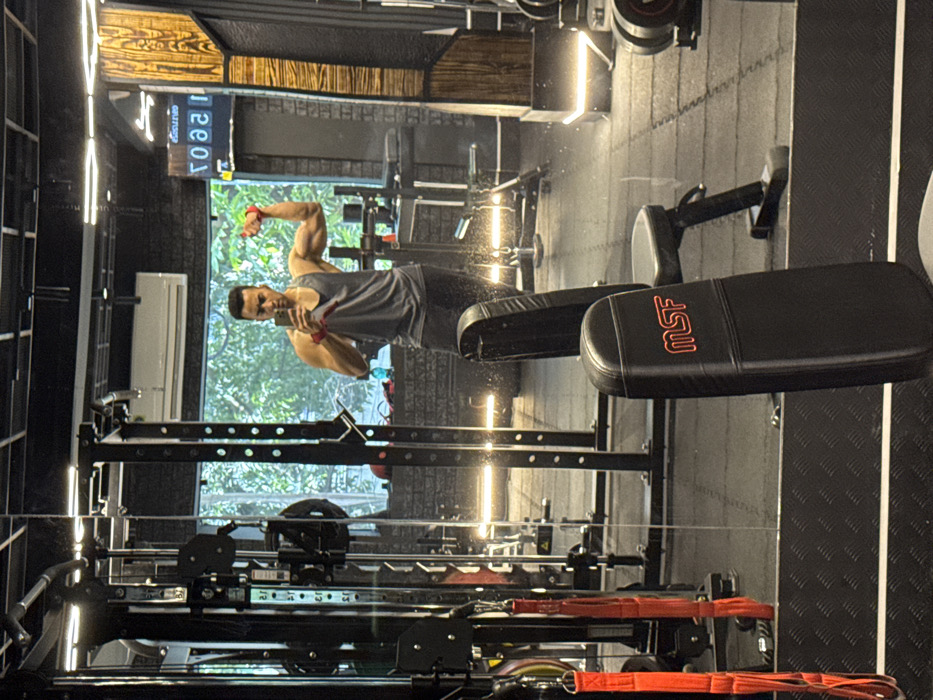 A man flexes in a gym mirror, wearing a gray tank top and wrist straps. His reflection is clear, showcasing his bicep muscles. The gym is equipped with various machines and weights, including an MSF bench press. The background includes a window with foliage visible outside. The scene is well-lit with overhead fluorescent lights and other light fixtures, creating a bright and modern atmosphere.