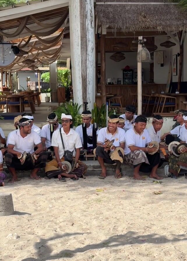 A wide shot shows approximately a dozen Balinese men seated on a sandy beach, playing traditional Balinese musical instruments