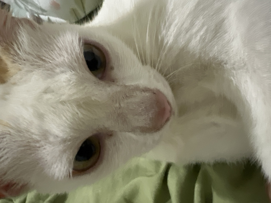 A domestic cat, located in Cam Đức, Vietnam, is depicted in a frontal, close-up view. The cat possesses predominantly white fur with light tan coloration visible on the top of its head and ears. Its eyes are light brown with black pupils, and its nose is pink. Small dark flecks are present on the skin around the eyes and nose. The cat is resting on a textured, light-green fabric, likely a blanket, which forms the background on the left and bottom. A lighter, possibly patterned, fabric is visible on the upper right side of the frame. The cat's gaze is directed forward and slightly downward.