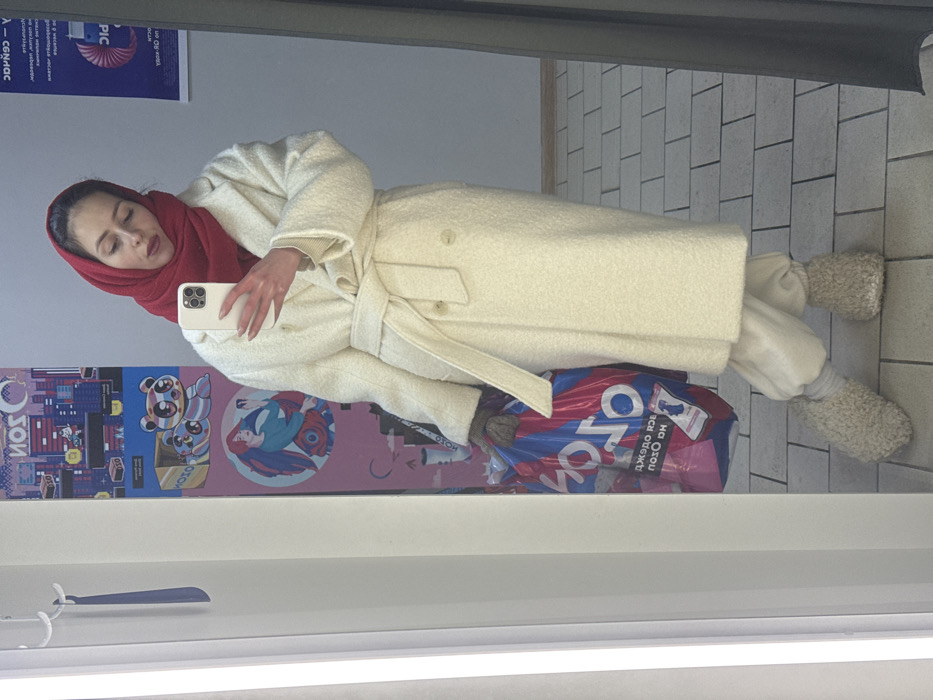 A female individual is taking a mirror selfie inside what appears to be an OZON parcel pickup point or a retail space in Yekaterinburg, Russia. The subject, wearing a long, textured cream-colored coat belted at the waist, a red headscarf, cream-colored pants, and fuzzy light-colored slippers over white socks, holds a white smartphone in her left hand to capture her reflection. Her right hand, potentially gloved, clutches a blue and red plastic shopping bag marked with the "OZON" logo and Cyrillic text. The mirrored background reveals multiple colorful promotional posters, prominently featuring "OZON" branding, cityscapes, a panda character, and an animated female figure. An additional reflected poster on the right displays further Cyrillic text. The floor consists of light grey rectangular tiles arranged in a staggered pattern. A white wall with a vertical light fixture and a hanging shoehorn is visible on the left.