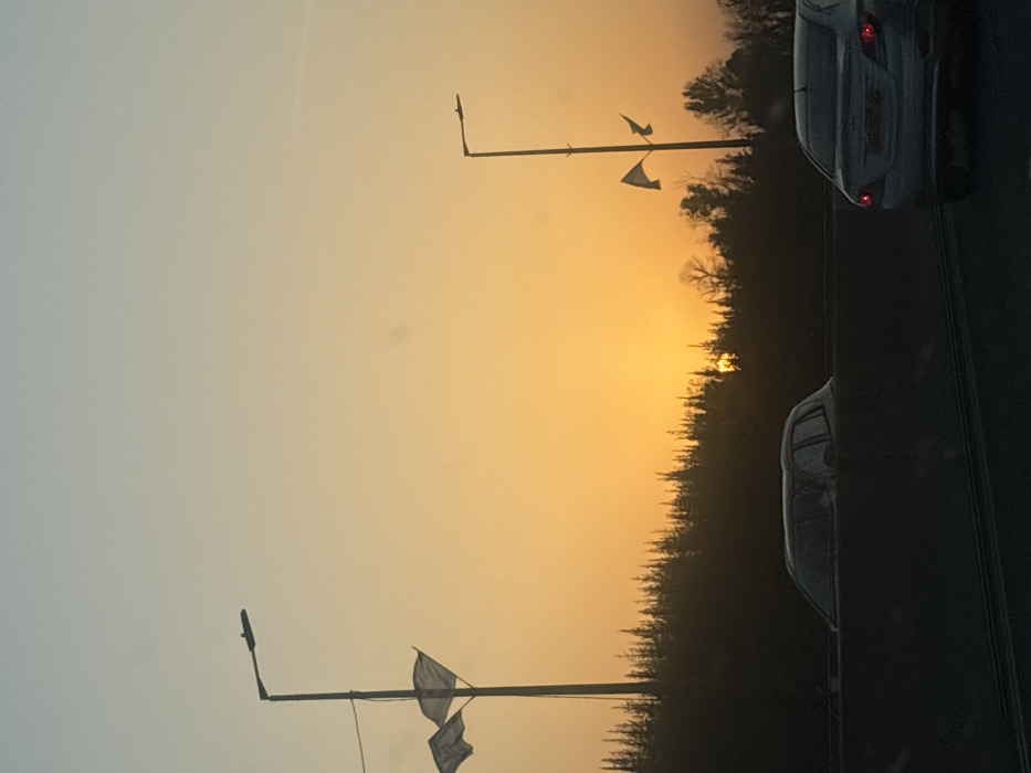 This image displays an outdoor scene at either sunrise or sunset within the Mate Yehuda Regional Council, Israel. The sky transitions from a light blue at the top to a bright orange-yellow at the horizon, where the sun is partially visible behind a dark, silhouetted treeline composed of numerous evergreen trees. The foreground features a multi-lane roadway with a dark concrete median. Two tall, dark streetlights stand against the horizon. The streetlight on the left has two light-colored, possibly white, flags attached, extending to the left. The streetlight on the right also has two light-colored flags attached, extending to the right. On the roadway, a dark-colored SUV or hatchback is partially visible behind the median on the left, showing its roof and upper body. A light-colored sedan is visible from the rear in a foreground lane on the right; its license plate is obscured. No people are discernible.