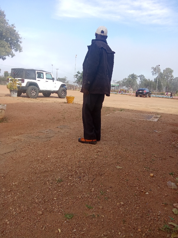 The scene, located in Bar Jirgi Summa, Nigeria, depicts an outdoor environment under a lightly clouded blue sky. In the immediate foreground, a person stands with their back to the camera, positioned slightly right of center. They wear a dark, possibly black, jacket over dark trousers and an off-white baseball cap. Their footwear consists of distinctive orange shoes with black soles. The ground beneath is reddish-brown, composed of loose soil and gravel, with sporadic patches of green vegetation and minor debris. To the left, a white four-door Jeep Wrangler-style vehicle with a black soft-top is parked on the unpaved surface. This vehicle features oversized black wheels with off-road tires. Adjacent to the Jeep are a grey concrete planter containing a leafy green plant and a yellow plastic bucket on the ground. Further into the midground, a dark-colored sedan or small SUV is visible on a dirt road that stretches horizontally across the frame. Beyond this road, several light poles are visible, alongside a partially obscured green and white sign. A distant area features what appears to be a recreational park with playground equipment, where several small figures, likely individuals, are engaged in activity. The background is characterized by numerous trees with light green foliage, some appearing hazy due to distance, under a bright, clear sky. The overall environment suggests an open, semi-developed area with elements of both natural landscape and human infrastructure.