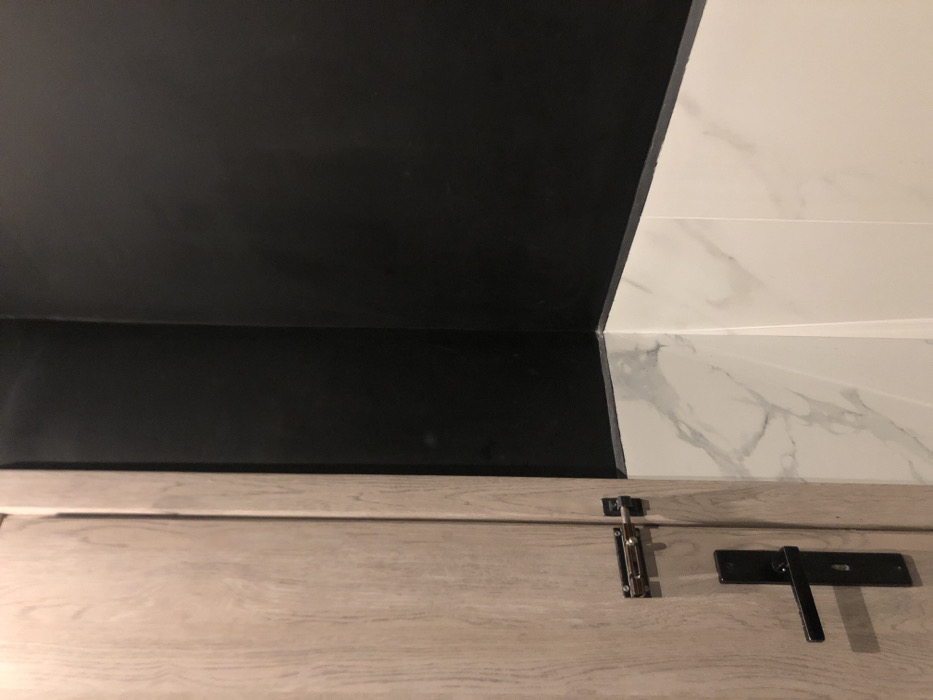 top portion of a closed wooden door with a black door handle and a silver latch. The door is partially open and appears to be in a bathroom or shower. The top of the door is covered by a black ceiling. The bottom half of the image shows a white and black tiled wall with a black edge. The scene is located in Paleo Faliro, Greece, at the coordinates 37.929, 23.684. The image appears to be taken from a low angle.