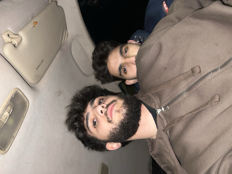 Two young men are close to each other in a car. One has a full, dark beard and is wearing a brown hoodie. The other is positioned behind him, only his face visible. The car's interior is visible, including the roof liner, sun visor, and a dome light. The setting appears to be nighttime or a dimly lit environment.