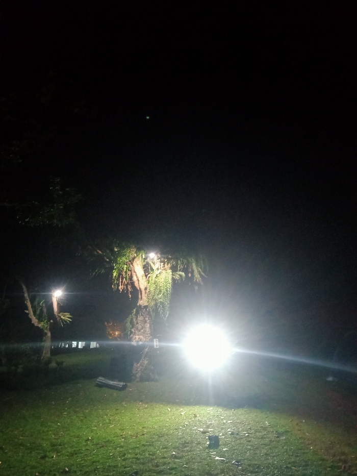 The image depicts a nighttime outdoor scene in Ciherang, Indonesia. A grassy area occupies the lower third, illuminated by multiple artificial light sources. The most prominent light, positioned in the lower right, emits an intense white glow with noticeable lens flare and horizontal light streaks, significantly overexposing that section of the frame. In the midground, two trees are visible. The central tree has a thick trunk and dense foliage, with a light source mounted high on its structure, illuminating its leaves, which appear to include ferns. To the left, a smaller tree with sparser foliage is also illuminated by a distinct light source. A third, less intense light is visible further back on the left. The background is largely obscured by darkness, with faint, indistinct structures or distant lights discernible. The sky is uniformly dark, with a single minute, green luminous point visible in the upper central portion. No individuals or specific actions are discernible within the scene.