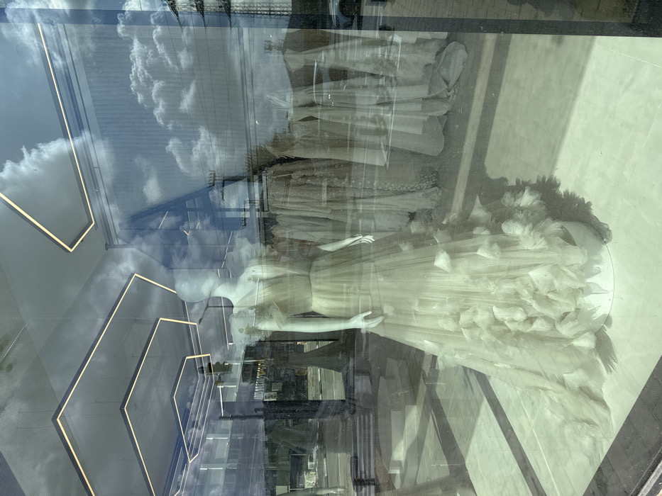 The scene depicts the display window of a formal wear or bridal shop in Holon, Israel. A white, headless mannequin stands centrally on a low, circular white platform, showcasing a light-colored, floor-length gown. The gown features a deep V-neckline, short ruffled sleeves, and a voluminous skirt adorned with numerous irregularly shaped, soft fabric appliqués, creating a textured, layered effect. A train of the dress extends onto the light-colored, polished floor of the display. In the background within the shop, racks hold additional formal dresses, predominantly in light hues. The shop interior features modern, geometric ceiling lights with illuminated linear elements. Reflected in the glass storefront window, the exterior environment is prominently visible. A partly cloudy sky with cumulus formations dominates the upper portion of the reflection. Reflected elements from the street include a utility pole with multiple power lines on the right, a distant larger utility tower, and a traffic light on the left, displaying a red signal. Paved surfaces, indicative of a street and sidewalk, are reflected at the lower edge. Distant buildings and a faint reflection of a vehicle are also discernible. The overall impression is an urban or semi-urban setting in Holon.