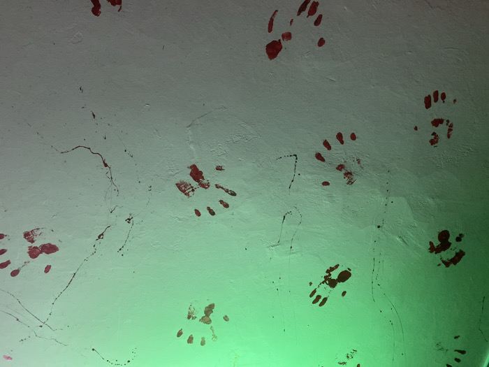A white, textured wall is adorned with numerous red handprints and splatters, creating a macabre and unsettling scene