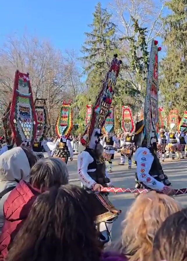 group of people dressed in traditional Bulgarian Koukeri costumes dancing in a parade