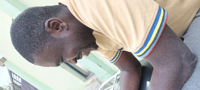 A dark-skinned man leans forward, wearing a tan shirt with striped trim on the sleeves. His head is angled down, revealing a close-cropped haircut and the side of his face. Part of his neck and shoulder are visible. The background shows a light green wall and window frame. Another person's grey pants are barely visible in the corner of the image. The overall composition is slightly angled.