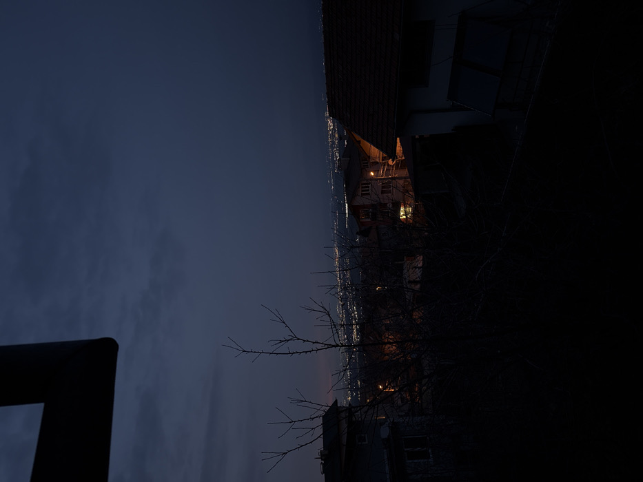 The image depicts a residential area in Lozen, Bulgaria, at twilight or early night. The sky occupies the upper two-thirds of the frame, presenting a dark blue-grey hue with faint cloud formations. A dark, angular structure, likely part of a building or window frame, is visible in the upper left corner, partially obscuring the sky. In the mid-ground, a dense cluster of bare tree branches without foliage dominates the center, obscuring portions of the residential structures below. Below the tree line, several buildings are visible on a hillside. To the left, a light-colored multi-story building with dark window openings is partially obscured by vegetation. Centrally, a multi-story residence with a reddish-brown tiled roof features an illuminated window emitting an orange light. Adjacent to this building, a streetlamp on a pole emits an orange glow. To the right, the prominent roof of a residential structure, with dark red tiles, angles into the frame. A dark, rectangular fixture, possibly a solar panel, is visible on its side. In the distant background, a sprawling urban area is visible, characterized by numerous scattered points of artificial light against the dark horizon, indicative of a city at night. The lower portion of the image is in deep shadow, rendering details indistinguishable. No individuals or specific actions are discernible within the scene.