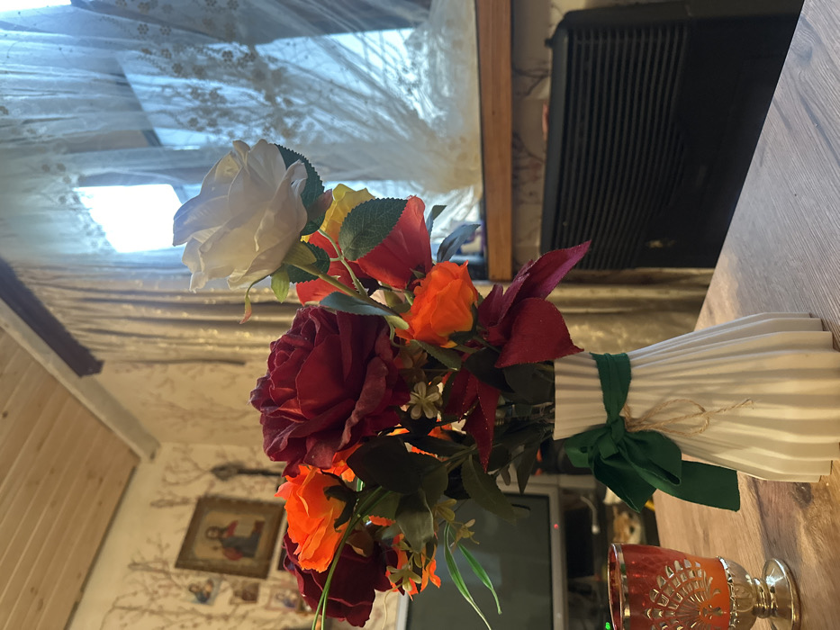An indoor scene in Lanchkhuti, Georgia, depicts a floral arrangement prominently displayed on a light-colored wooden table