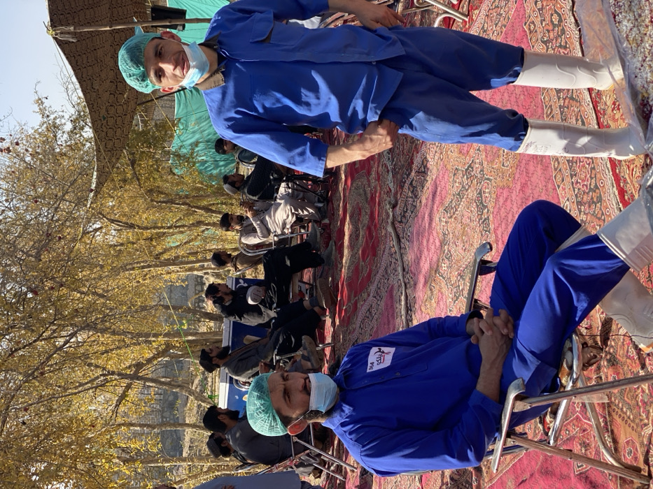 An outdoor scene in Sard-E 'olya, Afghanistan, shows two men in blue uniforms, light green hairnets, face masks pulled below their chins, and white rubber boots in the foreground, positioned on a red and black patterned carpet