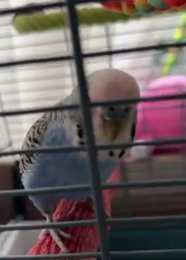 parakeet inside a cage, perched on a red textured platform. The parakeet has blue feathers on its body and black and white striped markings on its head. The top of the parakeet's head appears to be white with a slight pinkish hue. The cage is made of vertical and horizontal metal bars. In the background, a colorful rope toy and a pink object are visible. The camera angle is slightly elevated, looking down at the parakeet. The parakeet looks around, directly facing the camera at times.