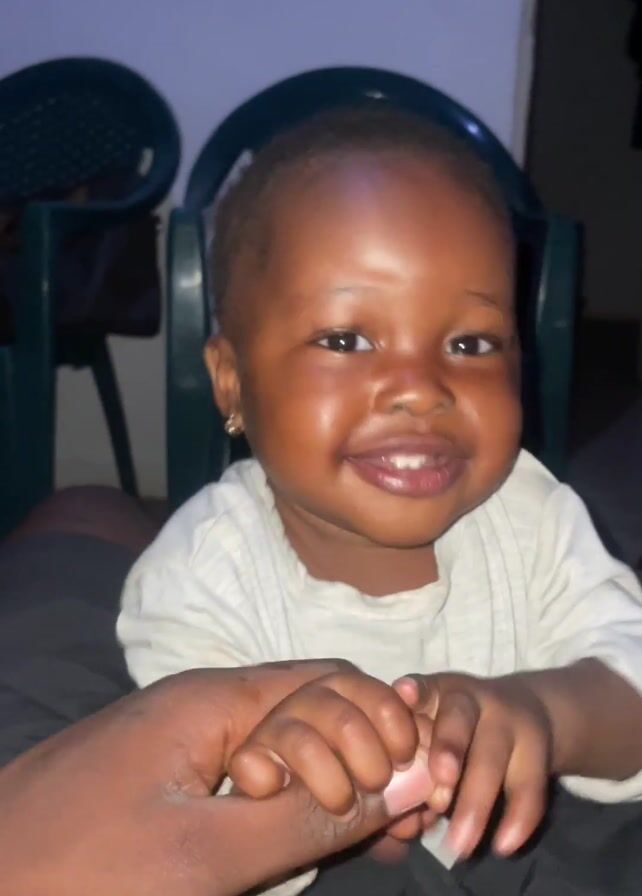 A young child with dark skin and short hair is lying on someone's lap and holding their hand. The child is wearing a white, long-sleeved shirt and smiles, displaying their teeth. The background includes two green plastic chairs and a white wall. The lighting is subdued.