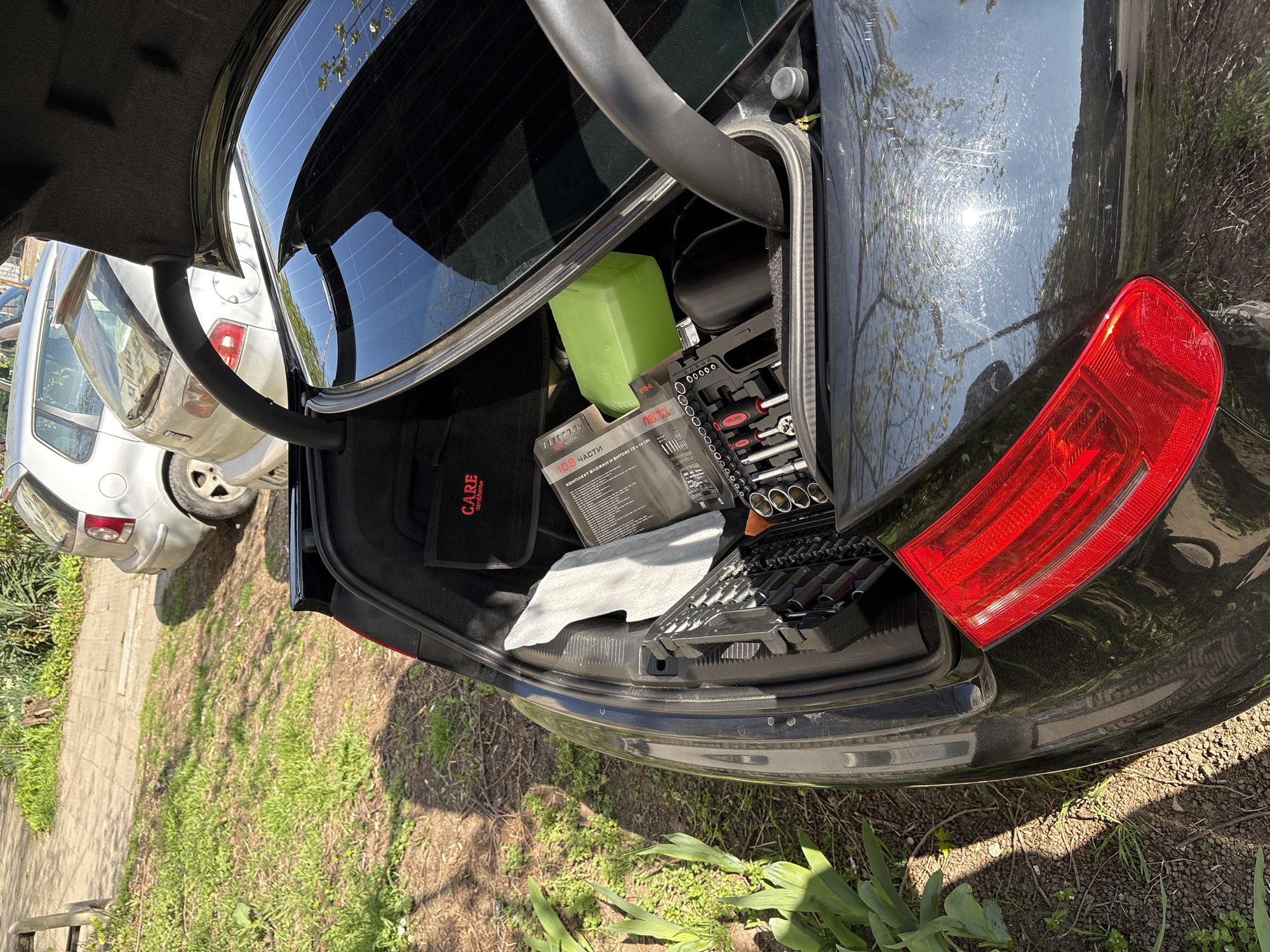The open trunk of a black car is filled with various items, including a toolbox, a green container, a black mat with the word "CARE" printed on it, and a white cloth