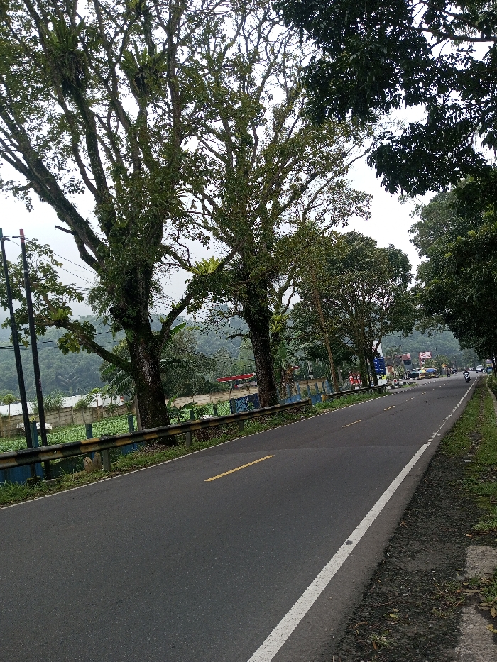 This image captures a two-lane asphalt road in Sandamal Eliya, Sri Lanka, under an overcast sky. The road features a yellow dashed center line and a solid white line demarcating the right shoulder, which consists of a narrow strip of dark earth and sparse grass. Along the left side of the road, a blue and yellow metal guardrail is present. Beyond this barrier, a lower elevation area contains dense green vegetation, potentially an agricultural field. Several tall, mature trees with prominent branches and numerous epiphytic plants (ferns, mosses) line the left side of the road, with utility poles and wires visible among them. A verdant, forested mountainous landscape extends into the background on the left. On the right side of the road, a dense canopy of trees partially obscures the view. In the distance, along the right side of the road, multiple buildings are visible, including one with a red roof, suggesting a commercial or residential zone. A single motorcycle, operated by a lone rider, is observed traveling away from the camera on the road. No other specific individuals or interactions are clearly discernible.