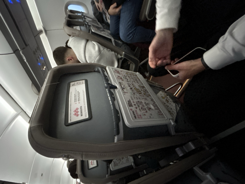 An airplane interior is shown with seats, seatbacks, and tray tables