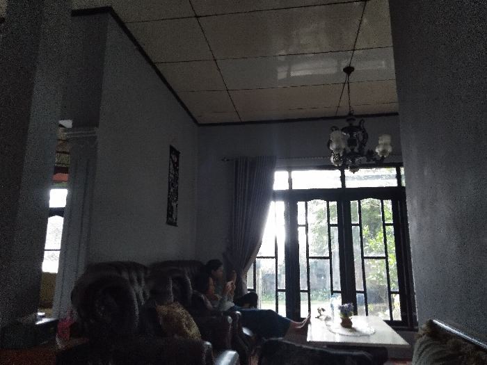 The image displays an interior scene, likely a living room, located in Beitostølen, Norway. The perspective is from a low angle, looking across a dimly lit room towards a large, multi-paned window unit that dominates the background and provides strong natural backlighting. In the foreground and mid-ground, dark, upholstered armchairs and sofas are visible, partially occupied by several individuals whose features are indistinct due to deep shadows. To the right of the frame, a light-colored rectangular table is positioned in front of the window, bearing two plastic bottles and a small vase containing flowers. A person is seated at this table with their back partially to the camera, facing the window. The large window unit features dark frames dividing it into numerous rectangular panes, through which exterior foliage and trees are discernable. Light-colored curtains are drawn on the left side of this main window. A dark, ornate chandelier with multiple light sources hangs from the light-colored, possibly paneled ceiling. A dark, vertical decorative item is affixed to the wall to the left of the window. The walls are light-toned, with the immediate foreground wall appearing darker and textured. Archways or doorways leading to other areas of the dwelling are visible on the left side of the frame, revealing glimpses of further interior spaces. The scene depicts an indoor setting during daylight hours, characterized by high contrast due to the backlighting.