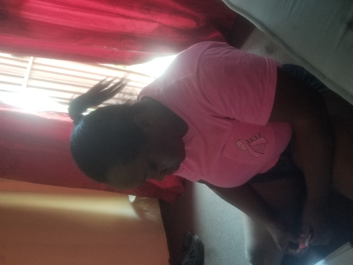 In Narayi, Nigeria, a female individual is observed seated on the floor indoors, facing left with her head angled downwards. She wears a pink short-sleeved t-shirt featuring a front pocket with a pink ribbon and a volleyball graphic, and dark shorts. Her dark hair is pulled back into a ponytail. Her hands are positioned in her lap, appearing to hold a small, unidentifiable object. The room has a light-colored floor and a tan-colored wall on the left. A brightly lit rectangular opening, possibly a window or doorway, is centrally located in the background, flanked by two red curtains. Strong natural light emanates from this opening, revealing a corrugated metal structure exterior. A dark object, consistent with shoes, is visible on the floor in the upper-left background.