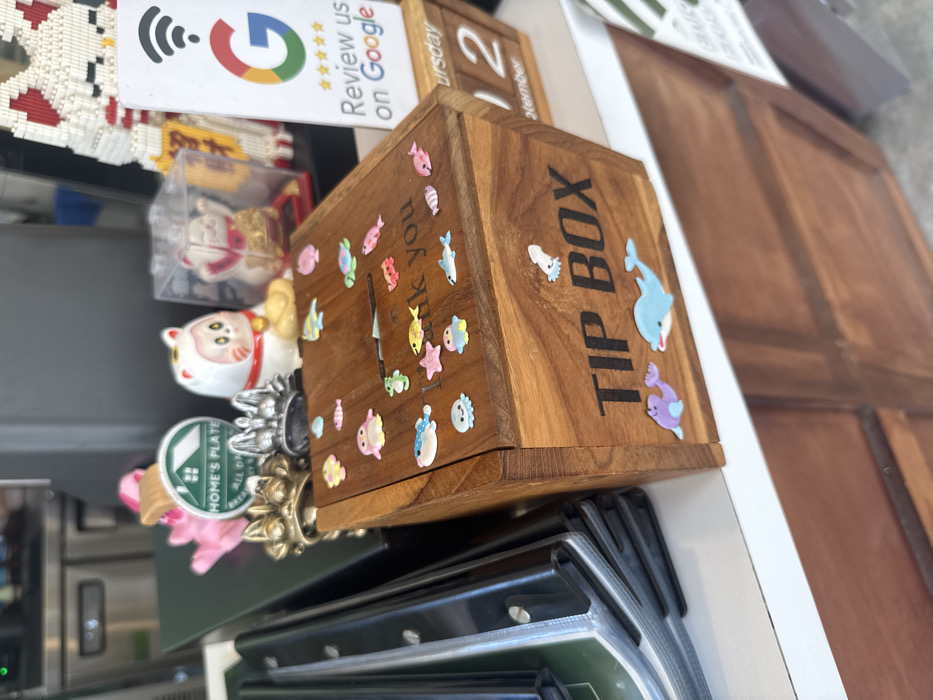 The image presents a detailed view of a commercial counter within an establishment located in Baan Hin Kong, Thailand. The central focus is a rectangular wooden tip box, profusely decorated with various colorful, small adhesive stickers depicting marine animals such as fish, dolphins, octopuses, starfish, sharks, whales, and squids. The phrase "TIP BOX" is printed in dark lettering on its front face, while the words "thank you" are partially visible on its top surface, which features a narrow horizontal slot for currency insertion. To the immediate left of the tip box, a stack of approximately seven black menu binders with clear plastic sleeves is present, alongside a dark green binder. Behind the tip box, from left to right, a circular green and white sign with a house icon reads "HOME'S PLATE ALL DAY" (with "DAY" partially obscured). Adjacent to this are two metallic decorative objects resembling stylized animal claws or paws. Further right are three Maneki-neko (lucky cat) figurines: a white one with red trim holding a gold coin, a smaller one contained within a clear plastic box, and a larger one constructed from white, red, and yellow building blocks. To the right of these figurines, a vertical white sign displays a Google "G" logo, a Wi-Fi symbol, and the text "Review us on Google" below a five-star rating. Partially visible on the far right is a wooden perpetual calendar indicating "12" and "September." The counter surface is white, and the area below features brown wooden cabinetry with vertical paneling. The background is blurred, revealing stainless steel kitchen or service equipment, consistent with a restaurant or cafe environment. No individuals or active interactions are depicted in the scene.
