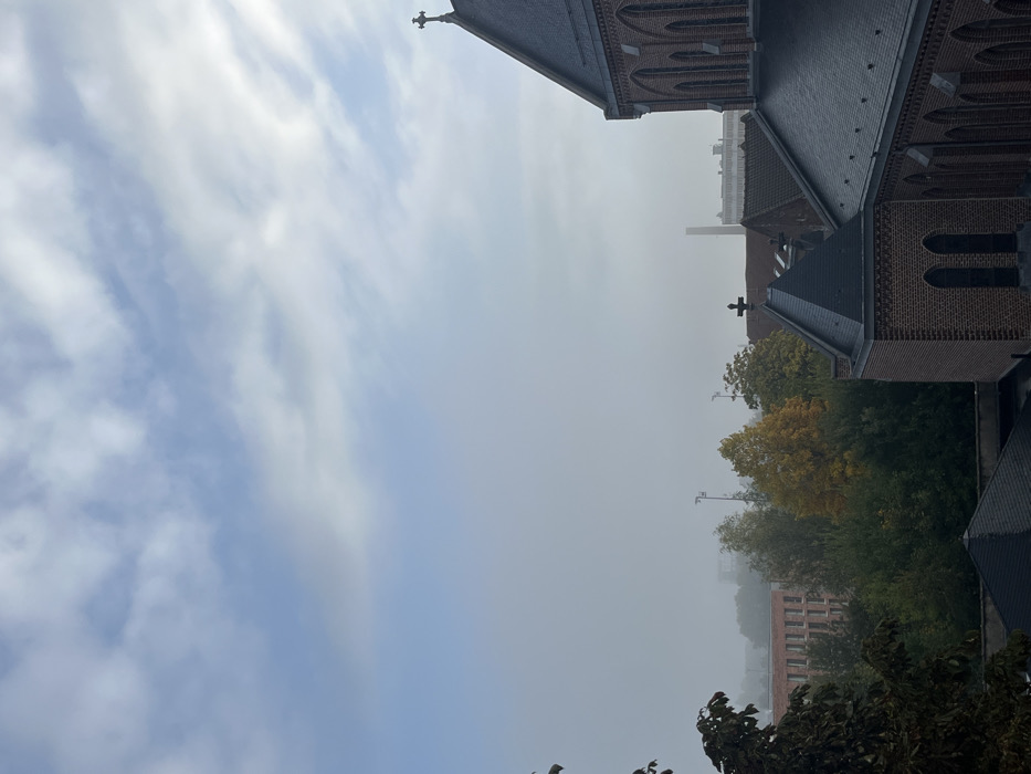 The image presents an urban landscape in Roubaix, France, under foggy, overcast conditions. The upper portion of the frame displays a pale blue sky with diffused white cloud cover, transitioning to a dense, light grey fog that obscures the lower two-thirds of the scene. On the right, a substantial church structure is visible, constructed from dark red brick with a dark grey slate roof. It features multiple arched windows. A Latin cross is affixed to the main gable's apex, and a second, smaller cross tops a lower, octagonal turret integrated into the church's architecture. To the left of the church, a cluster of deciduous trees exhibits autumnal foliage, with one tree prominently displaying bright yellow leaves. Further left, partially obscured by the fog, a multi-story building with reddish-brown brickwork and rectangular windows is discernible. Several tall, slender poles rise from among the trees in the mid-ground. In the distant background, partially veiled by the pervasive fog, a tall, slender, light-colored industrial chimney and faint outlines of other indistinct buildings are visible. No individuals or specific actions are depicted within the scene.
