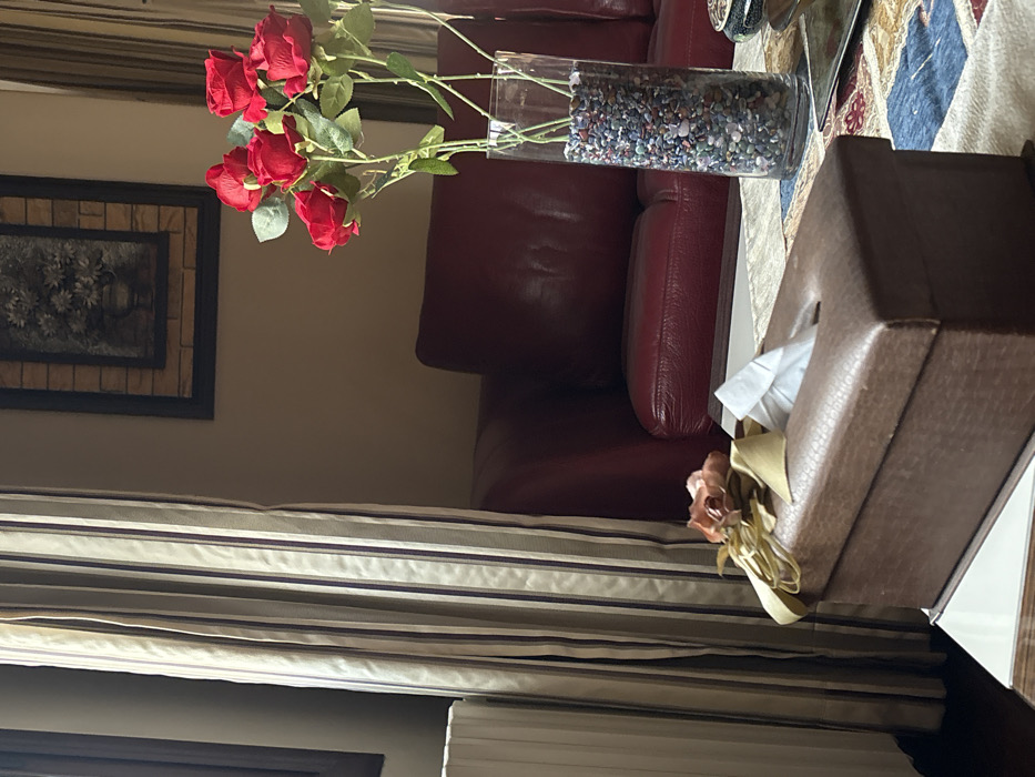 The image depicts an indoor scene within a structured environment, specifically a room located in As-Salihiya Municipality, Syria. The view is focused on a section of a room containing furniture and decorative objects, suggesting a living area. In the foreground, a rectangular dark brown textured box, resembling a tissue dispenser, rests on a light-colored surface, possibly a coffee table. A single white tissue is partially extracted from the oval opening on its top. To the left of this box, a light brown ribbon forms a decorative bow, with a single, faded artificial rosebud in a pale pink/peach hue positioned on top. Behind the tissue box, slightly to the right, a tall, clear cylindrical glass vase holds approximately 6-8 artificial red roses with green stems and leaves. The base of the vase is filled with an assortment of small, multi-colored pebbles in shades of grey, blue, purple, and brown. The vase is situated on a decorative fabric runner, displaying a patchwork-like pattern with squares of blue, brown, beige, and red. A reflective, dark metallic object is partially visible on the table to the far right. In the mid-ground, a section of a dark red leather or faux leather sofa or armchair is visible, comprising part of a backrest and an armrest, indicating seating arrangements. The wall in the background is a plain light beige or cream color. Centered on this wall, above the sofa, a dark-framed piece of art hangs, depicting a light-colored floral arrangement in a vase, set against a background with a brick-like or textured pattern. To the far left of the image, vertical striped curtains, featuring broad off-white stripes interspersed with thinner grey and purple/dark red stripes, hang beside a window. A dark window frame is partially visible behind the curtain, and a white, fluted radiator is present at the lower left edge. No individuals are present in the scene, and no explicit actions or interactions are depicted. The lighting suggests natural light entering from the left side of the room.