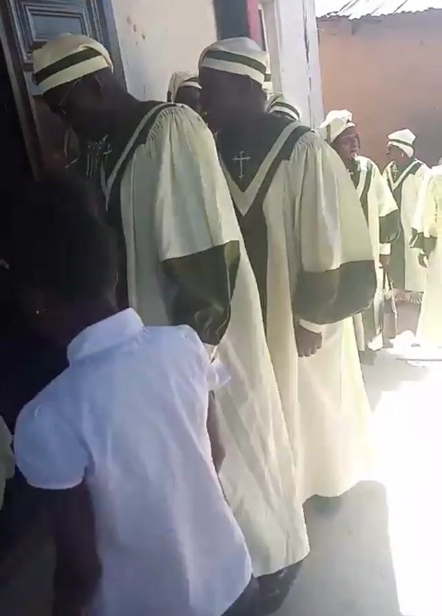 A group of people wearing long white and green robes and white hats are standing in a line. They are outside of a building and appear to be preparing to enter. A young girl in a white shirt is standing in front of them, watching them. One of the people in the robe is holding a piece of paper. The environment looks like a sunny day outside of a church.