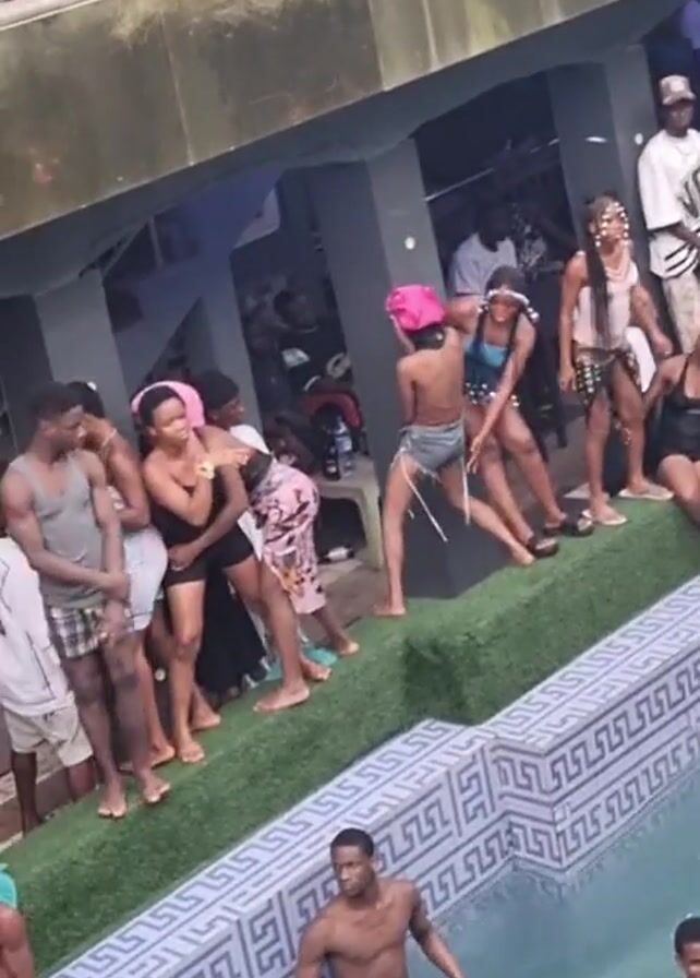 pool party. Several young adults, both men and women, are present. Some people are in the pool, some are standing or sitting on the poolside area. The people by the pool are talking and enjoying themselves. Music is playing in the background. The area is decorated with artificial grass. The architecture appears to be a multi-level building.