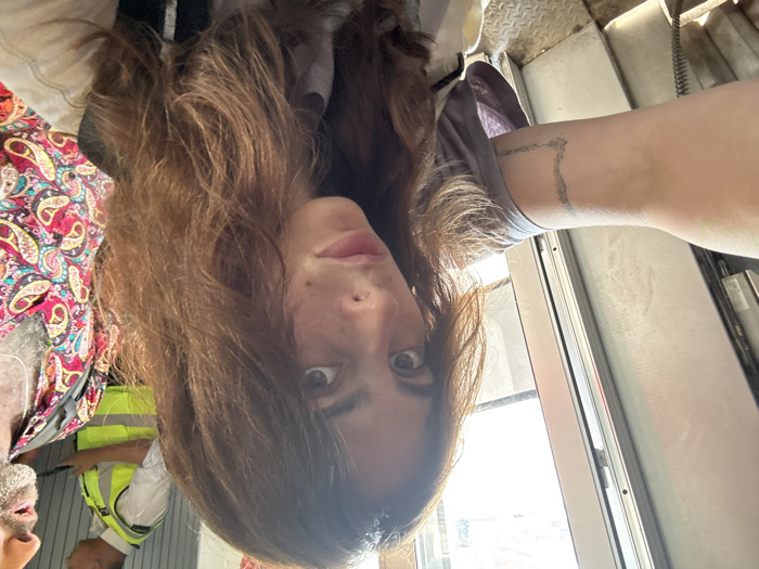 The image displays three individuals within an indoor environment, identified as Al Matar, United Arab Emirates. A female in the foreground occupies the central frame, looking directly at the camera while taking a selfie. She has long, wavy reddish-brown hair, a light complexion with visible freckles, and wears a light grey top. A faint, dark, linear marking is present on her left upper arm. To her right, a male is partially visible, wearing a red, pink, orange, and yellow paisley-patterned shirt and exhibiting facial stubble. In the background, behind the central female, another male stands wearing a white shirt beneath a yellow high-visibility vest with reflective stripes, appearing to engage with a small electronic device. The immediate surroundings consist of metallic wall panels on the left, a bright window with a metallic frame in the background, and a dark, textured floor.