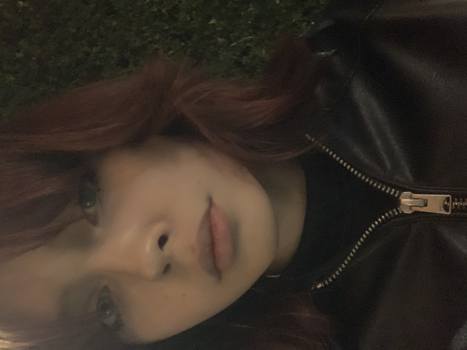 A close-up portrait depicts a young female looking directly at the camera. She has a pale complexion, light-colored eyes, and reddish-brown, shoulder-length hair with bangs. Visible freckles are present across her nose and cheeks. She is wearing a black mock-neck shirt underneath an open black leather jacket, featuring a prominent, partially unzipped metallic zipper. The lighting is dim, illuminating her face from the front. The background consists of dark green, densely packed foliage on the right side of the frame, suggesting an outdoor or garden setting. The specific location within Budva, Montenegro, cannot be determined from the visual information provided.