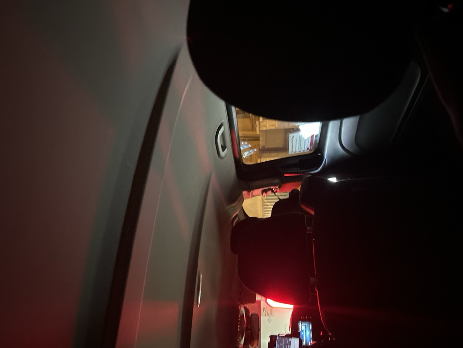 This interior shot, taken from a vehicle, shows the back of front seats and a glimpse out of the vehicle window. The interior lighting is dim, with red accents. The overhead sun visor is partially visible. Outside the window, a building facade is visible. In the foreground, a mobile phone sits on the armrest. The image seems to have been taken from the back seat of the vehicle.