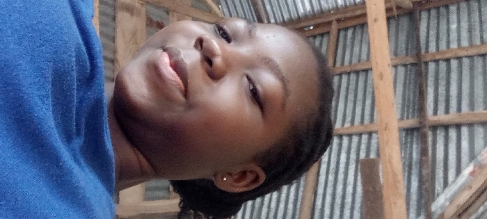 The image presents an upward-angled, close-up portrait of a young individual with dark skin, visible from the chest upwards. The individual is wearing a textured blue garment. Dark hair is styled in small braids and pulled back, with a small, light-colored stud earring visible in the right earlobe. The subject's gaze is directed slightly upwards and to the viewer's left. The background features a ceiling structure consisting of horizontally ribbed, corrugated metal sheeting supported by several parallel wooden beams or rafters. The construction style is consistent with common building practices in Nigeria. However, the image contains no specific architectural features, landmarks, or signage to definitively ascertain its precise location within the city of Opo Oshun, Nigeria.