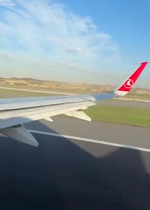 wing of a Turkish Airlines airplane as it speeds down a runway, preparing for takeoff
