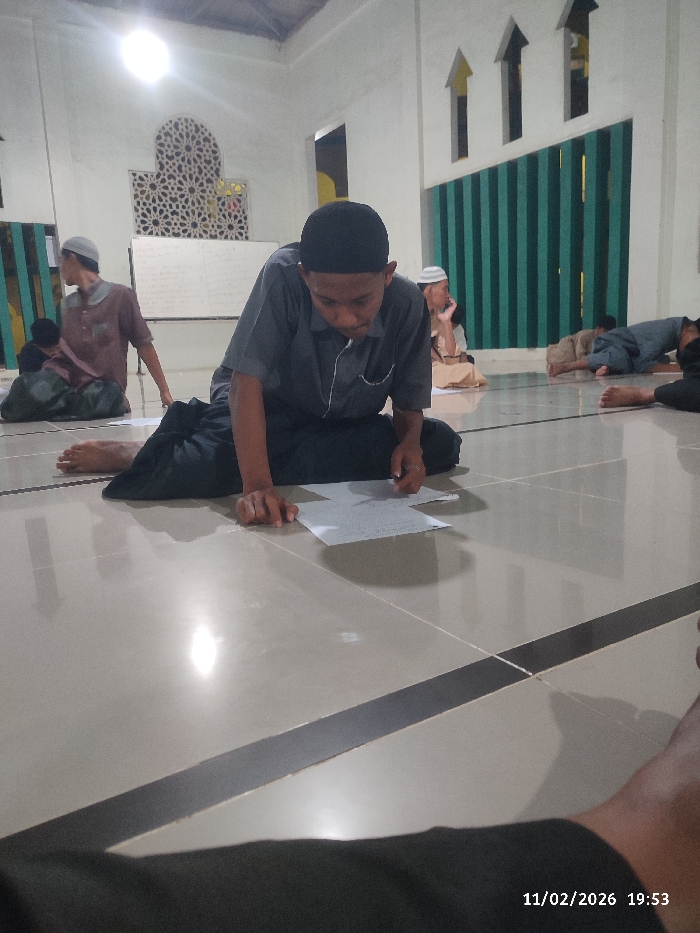 Inside a well-lit mosque, a young man wearing a black skullcap sits cross-legged on the tiled floor, intently studying a sheet of paper. Several other individuals are scattered throughout the room, some sitting and others prostrating. The mosque features green-striped walls, arched windows, and decorative latticework. A whiteboard is visible in the background. A date stamp on the bottom right indicates the photo was taken on 11/02/2026.