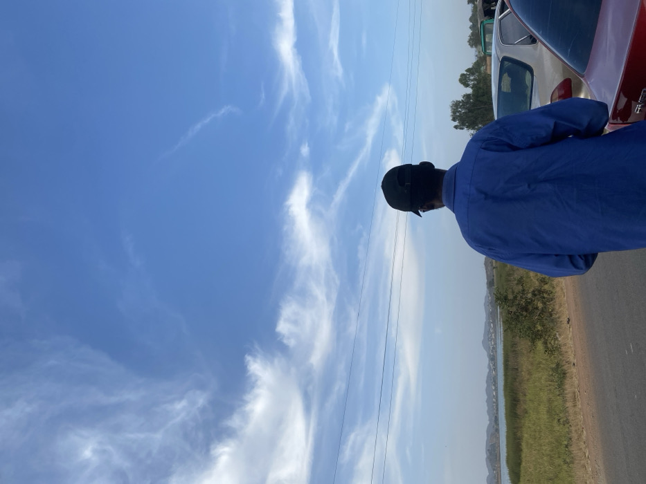 A man wearing a blue shirt and black cap stands beside a road. To his right are some parked cars, a grassy verge and a lake. The sky behind him is blue and filled with wispy white clouds. Power lines are also visible in the sky.